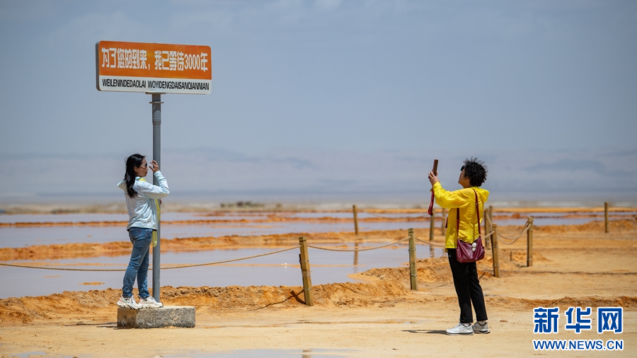 5月19日,專列游客在茫崖市翡翠湖景區游玩。