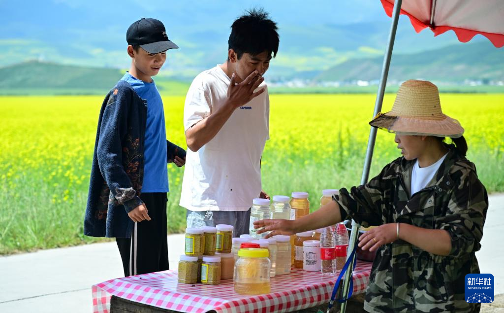 7月16日,在青海省海北藏族自治州門源回族自治縣,游客在吳鳳明家蜂蜜攤前品嘗蜂蜜。新華社記者 齊芷玥 攝