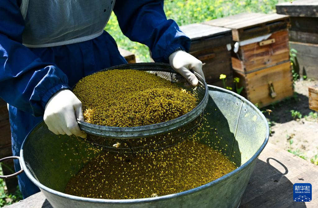 7月16日,在青海省海北藏族自治州門源回族自治縣,吳昊將花粉過篩。新華社記者 齊芷玥 攝