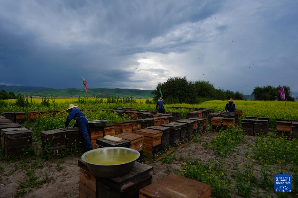 7月16日,在青海省海北藏族自治州門源回族自治縣,廖春容與吳昊過濾新鮮蜂蜜。新華社記者 齊芷玥 攝