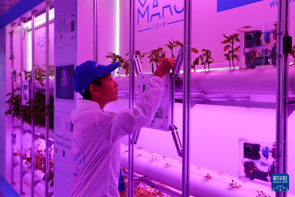 7月29日,在冷湖鎮冷湖實驗室,參加天文夏令營的學生查看芯片農場培育的蔬菜。 新華社記者 齊芷玥 攝
