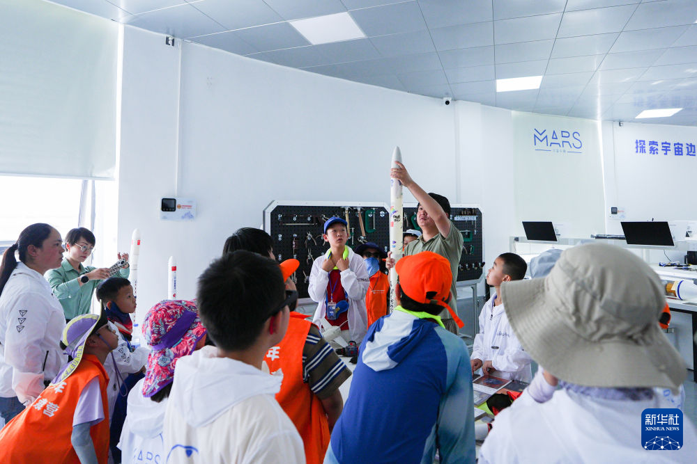 7月29日,在冷湖鎮冷湖實驗室,老師為天文夏令營的學生展示小火箭組裝。 新華社記者 齊芷玥 攝