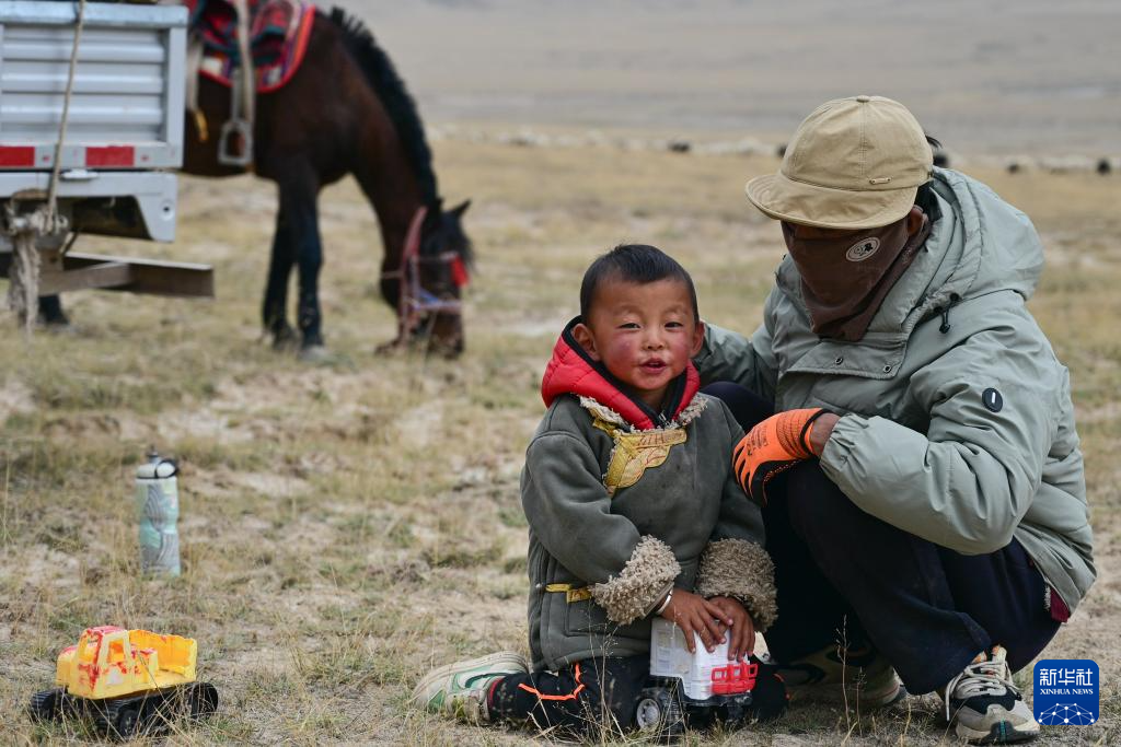 9月9日,在青海省海西蒙古族藏族自治州都蘭縣,牧民龍宮的小孫子在轉場休息時玩汽車玩具。新華社記者 齊芷玥 攝