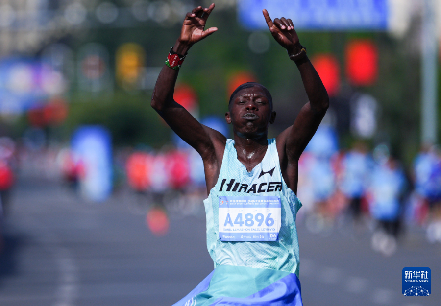 9月14日,肯尼亞選手丹尼爾·萊馬雄·薩萊爾·洛伊奧伊奧在比賽中沖線。最終,他獲得男子全程馬拉松冠軍。新華社記者 齊芷玥 攝