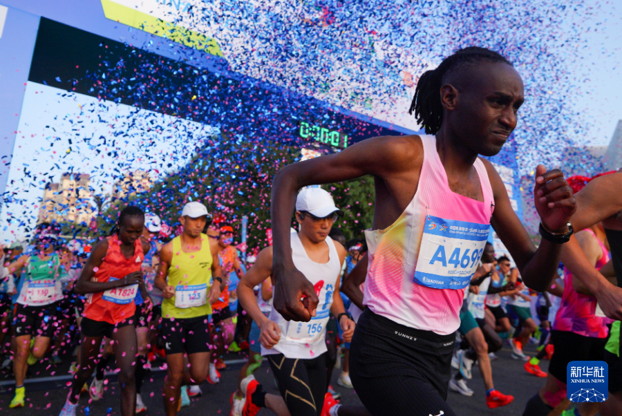 9月14日,肯尼亞選手科奇·所羅門(右前)在比賽中起跑。最終,他獲得男子全程馬拉松季軍。新華社記者 齊芷玥 攝