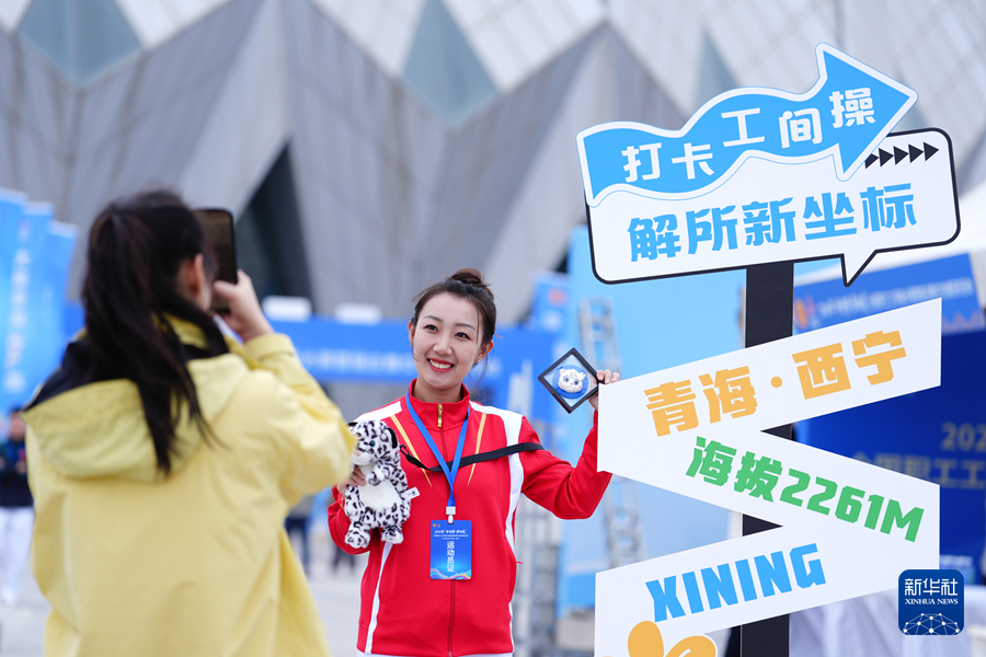 9月17日,參賽職工在青海體育中心外打卡留念。新華社記者 齊芷玥 攝