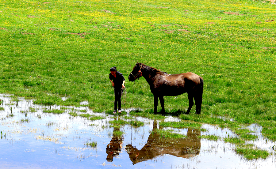 (095號攝影作品)【草甸水鏡 人馬相依】